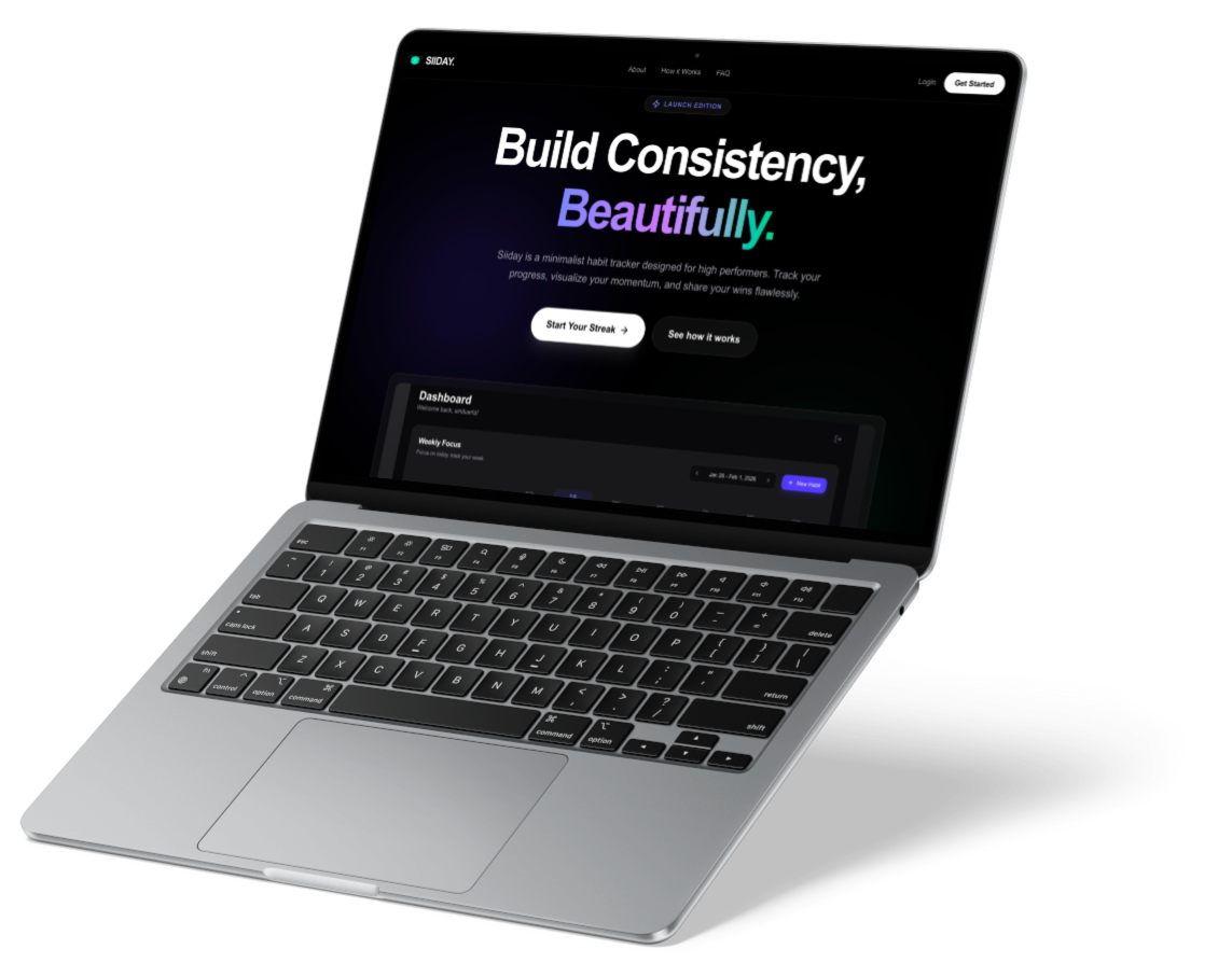 Siiday adalah platform habit tracker yang dirancang untuk membantu pengguna membangun kebiasaan baik dan mencapai tujuan mereka. Dengan antarmuka yang modern dan responsif, Siiday memungkinkan pengguna untuk melacak kebiasaan mereka dengan mudah dan cepat.